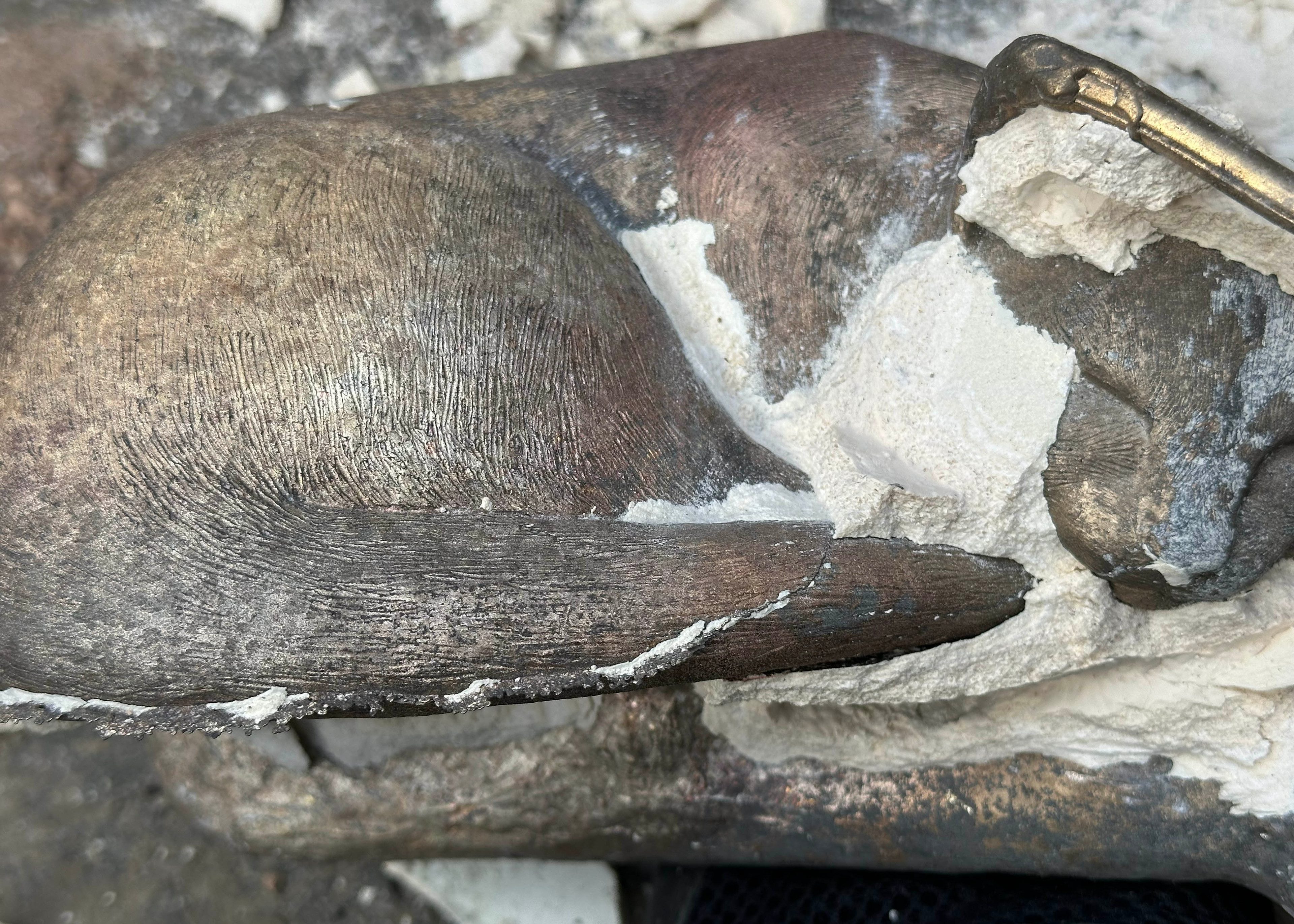 After letting the shell cool overnight, I cracked it open. Using a chipping hammer, I broke the large portions of shell off of the bronze. I then used a small pick to dig out the more stubborn and small pieces of shell. Once the majority of the shell was removed, I cut off the pour cup and sprue with a hacksaw.